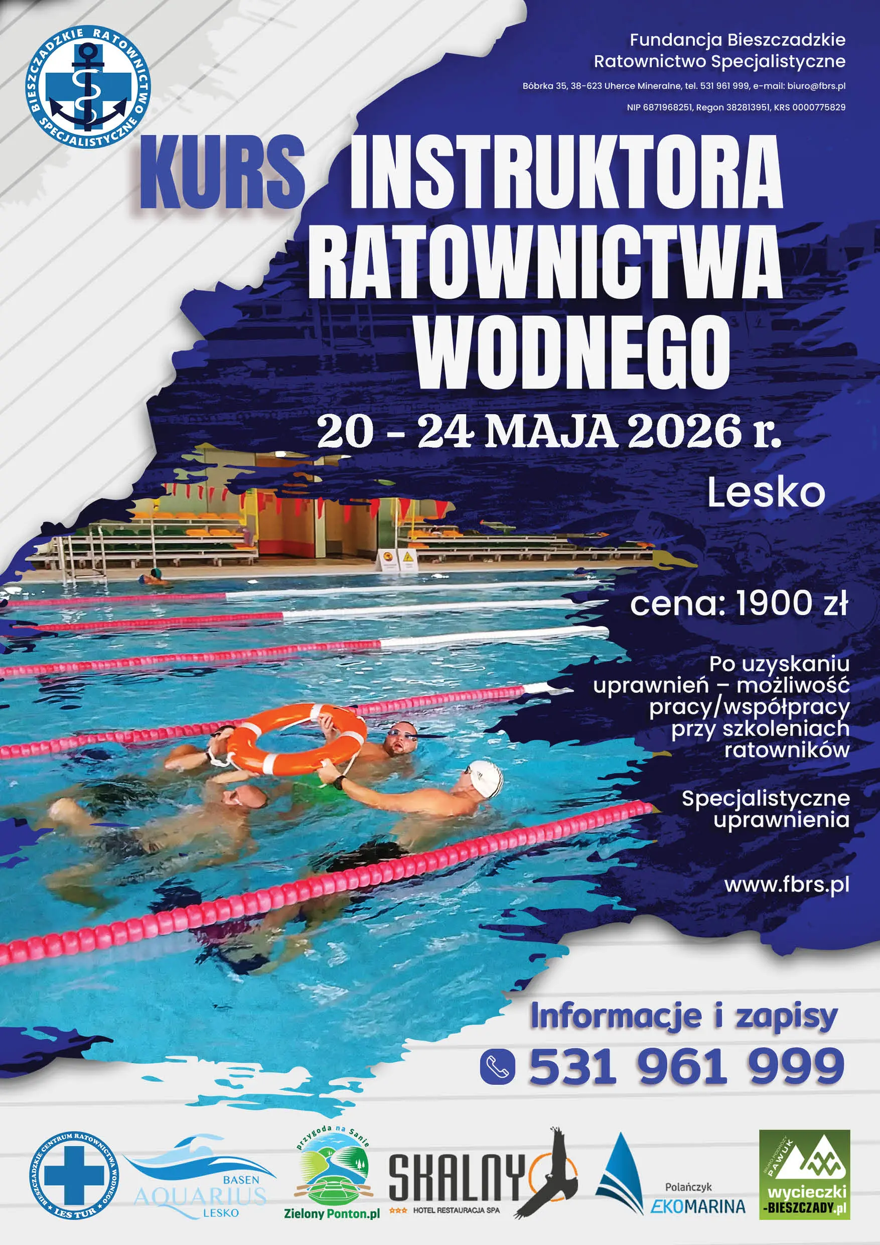 Kurs Instruktora Ratownictwa Wodnego 20-24 maja 2026 r. Lesko 27 kwietnia 2026 Kurs Instruktora Ratownictwa Wodnego termin: 20-24 maja 2026 r. gdzie: Lesko specjalistyczne uprawnienia wykwalifikowana i doświadczona kadra Instruktorów wspaniała przygoda, interesująca praca po uzyskaniu uprawnień – możliwość pracy/współpracy przy szkoleniach ratowników wodnych cena: 1900 zł zapisy i informacje tel. 531 961 999