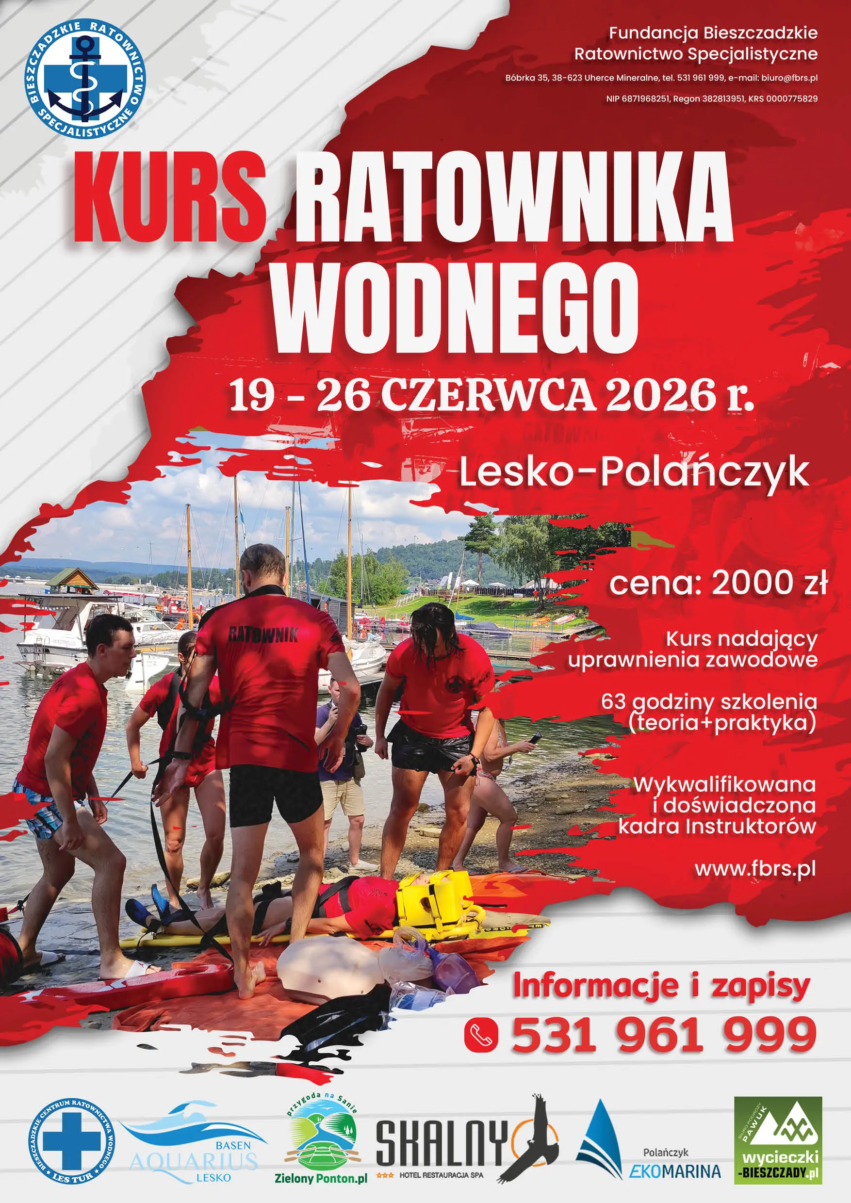 Kurs ratownika wodnego 19-26 czerwca 2026 r. Lesko-Polańczyk 27 kwietnia 2026 KURS RATOWNIKA WODNEGO – Kurs nadający uprawnienia zawodowe gdzie: Lesko-Polańczyk kiedy: 19 – 26 czerwca 2026 r. 63 godziny szkolenia (teoria+praktyka) wykwalifikowana i doświadczona kadra Instruktorów wspaniała przygoda, interesująca praca cena: 2000 zł zapisy i informacje tel. 531 961 999 Dla najlepszych oferujemy możliwość pracy/współpracy w przy zabezpieczeniu obszarów wodnych na terenie Podkarpacia i nie tylko Organizujemy również kursy KPP, sternika motorowodnego, instruktora pływania i inne. Fundacja jest jednostką współpracującą z systemem – Państwowe Ratownictwo medyczne.